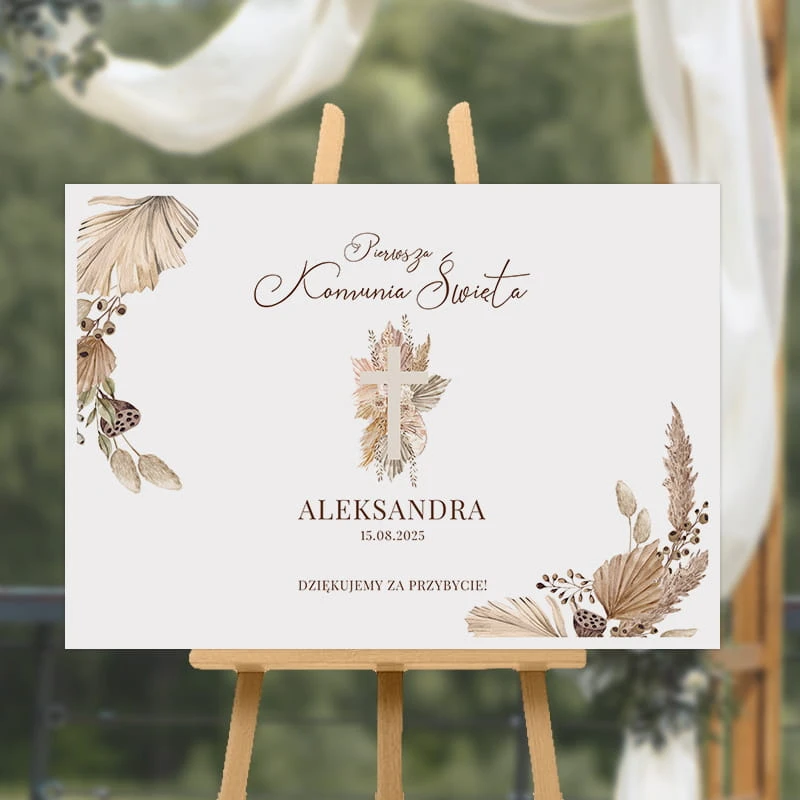 Plakat doskonale sprawdzi się jako element dekoracyjny przy wejściu na salę, w strefie powitania gości lub jako ozdoba głównego miejsca przyjęcia. Dzięki czytelnemu układowi i odpowiedniemu rozmiarowi jest dobrze widoczny i przyciąga uwagę. Na jasnym tle umieszczono minimalistyczne kompozycje roślinne w odcieniach beżu i brązu, a centralnym elementem jest symbol krzyża oraz podziękowanie dla gości. Całość uzupełnia personalizacja – imię dziecka oraz data uroczystości.