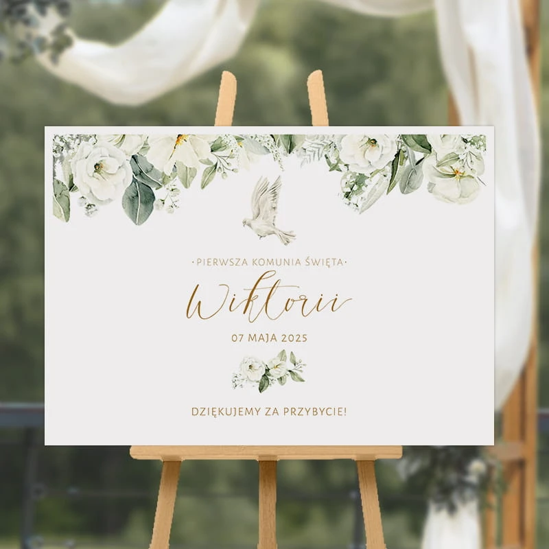 Plakat komunijny to stylowa dekoracja, która doskonale podkreśla wyjątkowy charakter Pierwszej Komunii Świętej i pomaga stworzyć spójną aranżację przyjęcia. Może pełnić funkcję eleganckiego powitania gości przy wejściu lub stanowić efektowne tło do pamiątkowych zdjęć.
