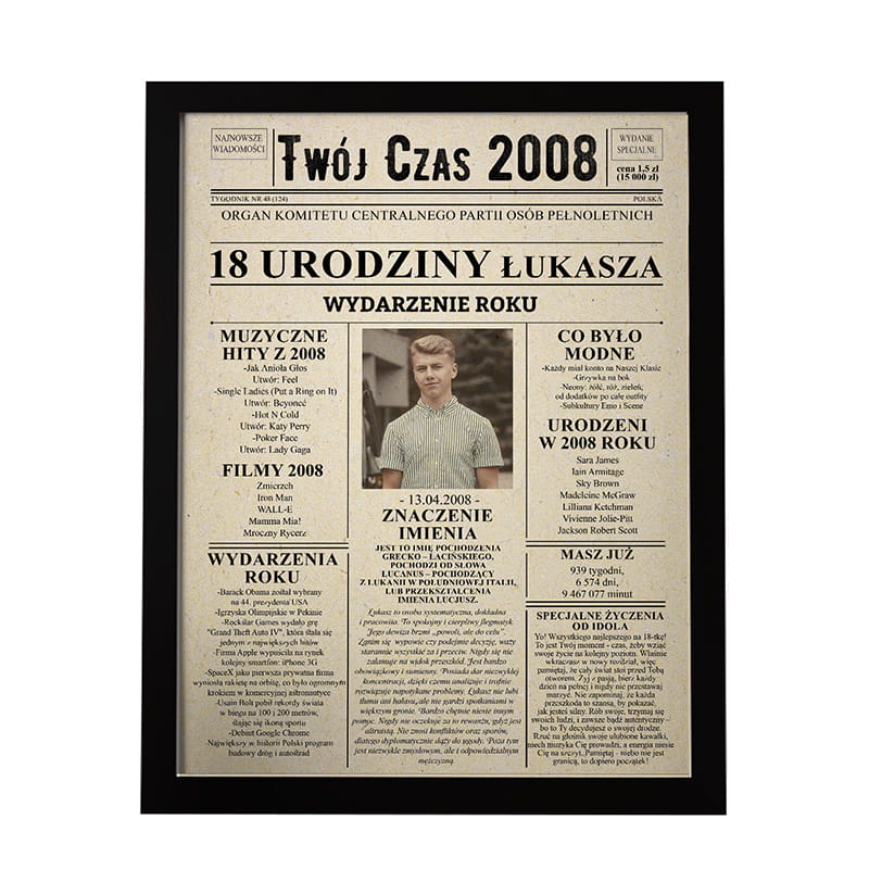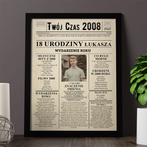 Plakat w ramie jest idealnym prezentem na 18 urodziny. Upominek w formie plakatu można wręczyć zarówno dziewczynie jak i chłopakowi. Może być wręczony jako dodatek do innego prezentu. Doskonale sprawdzi się również jako dekoracja w pokoju młodzieżowym, studenckim czy pierwszym własnym mieszkaniu, przypominając o mijających latach i najważniejszych momentach dorastania.