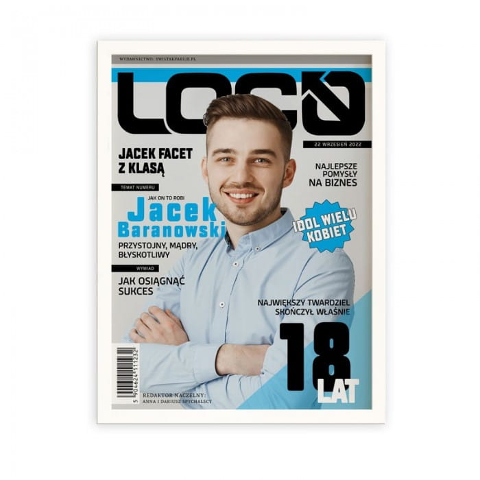 - Ten oryginalny w swej formie plakat to idealny sposób na uczczenie ważnego etapu w życiu młodego człowieka. Tytuły artykułów tematycznie będą kojarzyć się z wiekiem oraz samym świętującym. Nagłówki będą miały charakter żartobliwych poradników oraz zapowiedzi wywiadów. Plakat oprawiony jest w białą ramę, którą można powiesić na ścianie lub postawić na półce. To idealny prezent urodzinowy dla mężczyzny, który świętuje swoje 18 lub okrągłe urodziny. Plakat w formie okładki gazety to nietypowy i oryginalny sposób na podarowanie prezentu, który wyróżni się pośród innych upominków. Personalizacja sprawi, że prezent będzie niepowtarzalny.