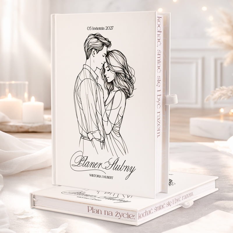 Subtelną okładkę planera zdobi grafika przedstawiająca zakochanych, wykonana z finezją i lekkością. Personalizacja na froncie z imionami narzeczonych i datą ich wielkiego dnia nadaje mu osobistego wymiaru. Trwałe wykonanie okładki zapewnia bezpieczeństwo zgromadzonych treści i podkreśla znaczenie zamieszczonych tam zobowiązań i marzeń. Elastyczna gumka na długopis i funkcjonalna kieszeń na luźne notatki są praktycznymi detalami, które ułatwiają codzienne korzystanie z planera. To prezent idealny dla narzeczonych, który stanie się przewodnikiem po ślubnych przygotowaniach i z czasem – skarbnicą wspomnień z niezapomnianego okresu zaręczyn i organizacji ceremonii.