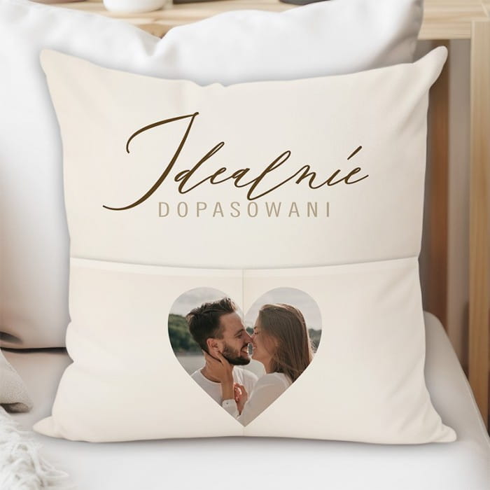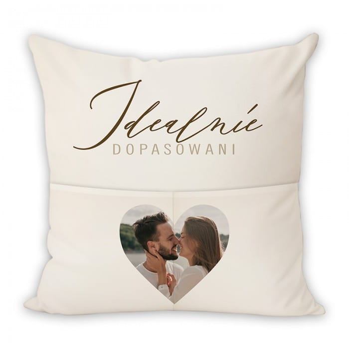 Wykonana z najwyższej jakości materiałów, poduszka zapewnia nie tylko miękkość, ale także trwałość na lata. Centralnym punktem jest serce, które może być ozdobione Waszym wspólnym zdjęciem, podkreślone napisem "Idealnie Dopasowani". Kremowa kolorystyka poduszki pasuje do każdego wnętrza, dodając mu ciepła i przytulności. Dodatkowo, praktyczne kieszenie umożliwiają przechowywanie drobiazgów, co sprawia, że poduszka staje się nie tylko ozdobą, ale także funkcjonalnym elementem wystroju wnętrza.