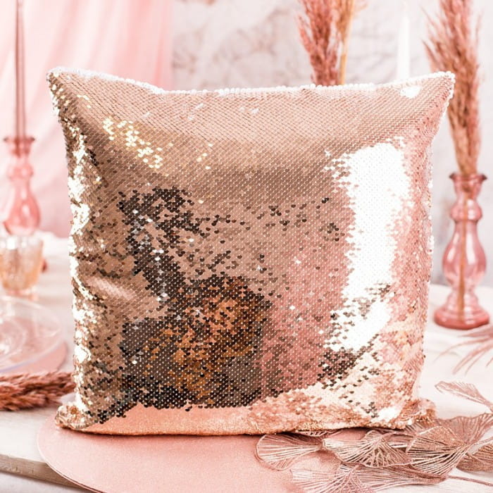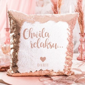Poduszka ma rozmiar zbliżony do klasycznego “jaśka” i w całości pokryta jest cekinami w modnym kolorze różowego złota. Cekiny dają efekt wysokiego połysku, przez co prezentuje się ona naprawdę zjawiskowo! Na poszewce znajduje się napis: Chwila relaksu… IMIĘ oraz niewielkie serduszko. Poduszka należy do serii dodatków i dekoracji na wieczór panieński Bride to be. Znajdziesz wśród nich mnóstwo akcesoriów, dzięki którym stworzysz niepowtarzalną atmosferę na imprezie. Poduszka z odwracanymi cekinami wygląda bardzo efektownie i stanowi oryginalny prezent dla kobiety na każdą okazję.