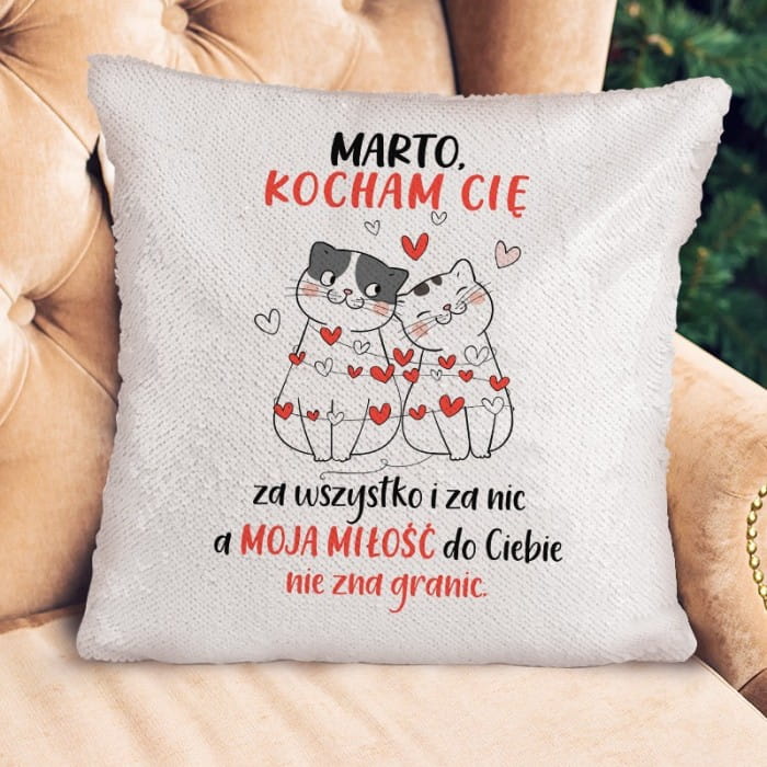 - Miękka i przytulna, a jednocześnie zachwycająca swoim designem – tak może zostać określona w kilku słowach poduszka personalizowana z cekinami na walentynki. Jest pokryta cekinami w całości, a napis odsłania się pod wpływem światła. Na górze znajdzie się zwrot do Twojej drugiej połówki, czyli jej imię, a także wyznanie miłości. Poniżej umieścimy grafikę dwóch zakochanych kotów, które stykają się główkami. Wokół nich widać sporą ilość serduszek. Poniżej będzie dopisek do słów: „Kocham Cię...” Zapiszemy: „za wszystko i za nic a Moja miłość do Ciebie nie zna granic”. Bez wątpienia te słowa podkreślają szczerość uczucia i oddanie drugiej osobie.