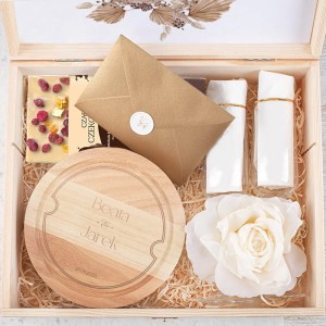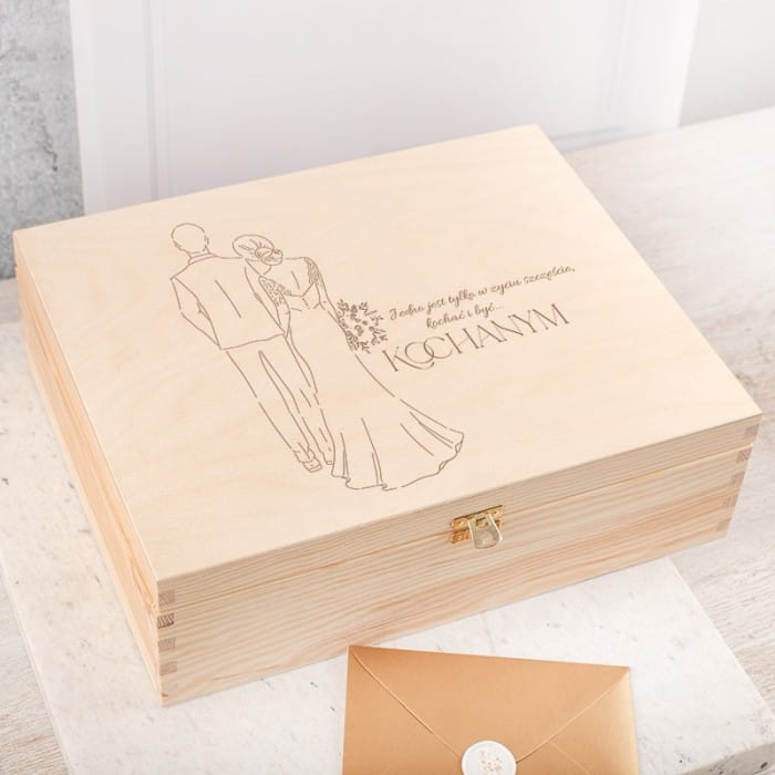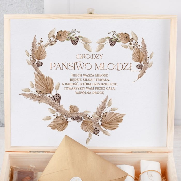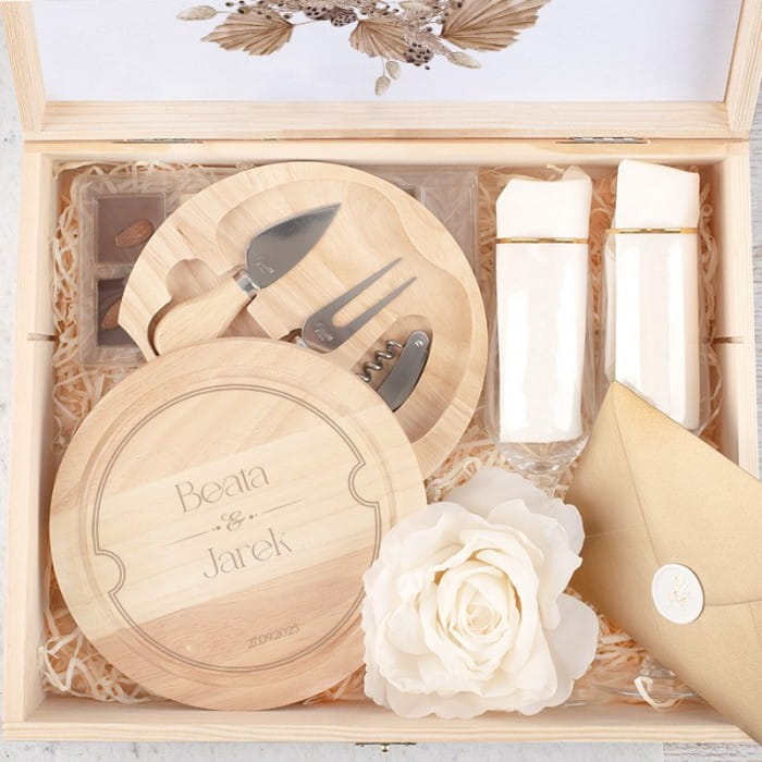 - Skrzynka powstała z surowego drewna, które wygładzono. Jej wieczko zdobione jest grawerunkiem z dedykacją i grafiką przedstawiającą kontur młodej pary. Wewnątrz znajduje się komplet praktycznych i luksusowych gadżetów. Dwa kieliszki ze złotymi rantami wprowadzają romantyczny nastrój. Czekoladki z orzechami są słodkim akcentem, idealnym dla każdego łasucha. Deska do serwowania przystawek z imionami pary młodej i datą ślubu to elegancki dodatek, który zachwyci nie tylko podczas specjalnych okazji. Wnętrze skrzyni skrywa również przydatne akcesoria. Dopełnieniem wizualnym jest jasny sizal i duży kwiat, które nadają całości wyjątkowego uroku. Skrzynia zawiera również złotą kopertę z lakiem, do której można włożyć banknoty lub życzenia ślubne.