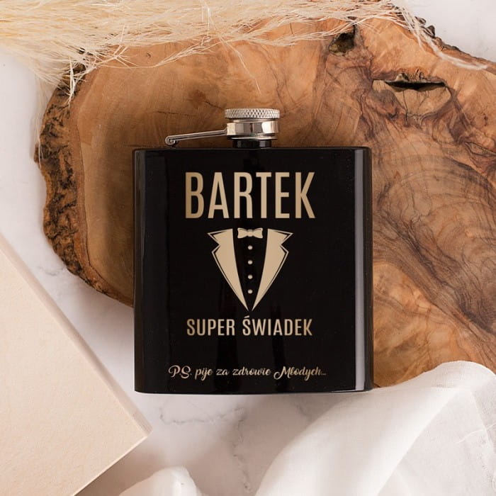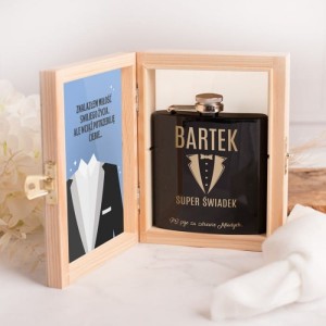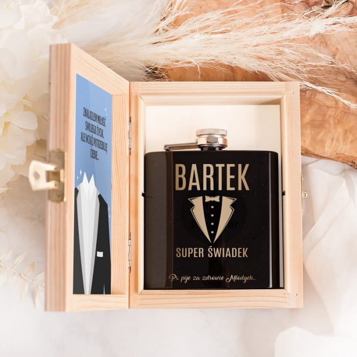- Wisienką na torcie jest piersiówka z wygrawerowanym imieniem, której widok chyba już wszystko wyjaśni obdarowanemu. Na froncie metalowej, czarnej piersiówki widnieje napis poprzedzony imieniem świadka: SUPER ŚWIADEK. Pije za zdrowie młodych. Żeby atrakcji nie zabrakło, po wyciągnięciu piersiówki znajduje się złota, okrągła zdrapka z oficjalnym pytaniem: CZY ZOSTANIESZ MOIM ŚWIADKIEM? Całość to misternie skonstruowana, pełna zaskakujących akcentów układanka.