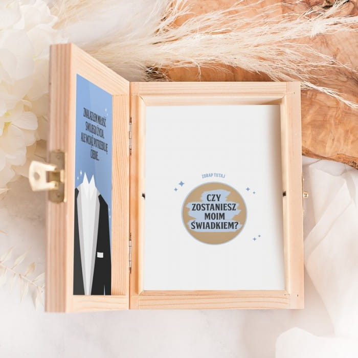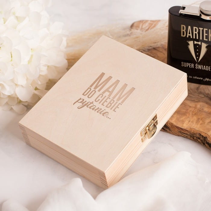 - Oryginalny zestaw upominkowy dla świadka, który składa się z drewnianej szkatułki oraz piersiówki, która skrywa się w niej. Na wieczku pudełka widnieje enigmatycznie brzmiący napis: Mam do Ciebie pytanie. Jest on wygrawerowany, więc jego estetyka i wygląd robi wrażenie. Szkatułka otwiera się jak typowa kartka z życzeniami. A jej wnętrze dzieli się na lewą i prawą stronę.