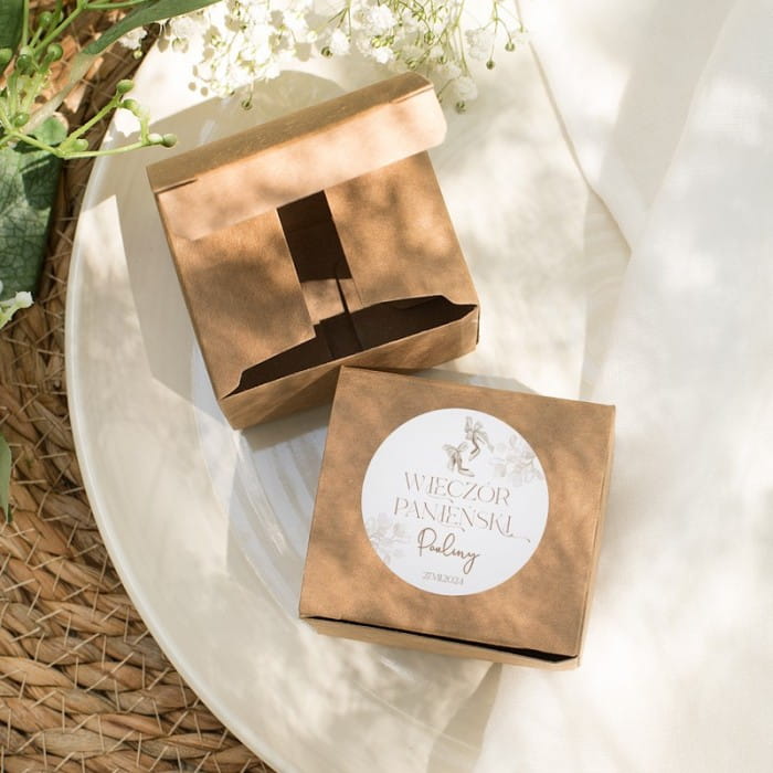 Wieczór panieński to wyjątkowe wydarzenie, które wymaga specjalnej oprawy. Ciekawym pomysłem jest impreza w plenerze. Aby stworzyć spójną aranżację na przedślubne garden party, zadbaj o odpowiednie dekoracje i dodatki. Poszukujesz pomysłu na to, jak efektownie zapakować prezent dla uczestniczek imprezy? W tej roli świetnie sprawdzi się to kraftowe pudełeczko z okolicznościową etykietą. Jego ekologiczny charakter będzie świetnie współgrać z naturalnym klimatem całej aranżacji. Zmieścisz w nim dowolny drobiazg — lusterko, gumkę do włosów albo słodkie cukierki. Wybór należy do ciebie!
