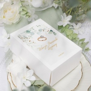 - Zestaw 10 pudełek i 10 etykiet do umieszczenia na ich wieczkach. Opakowania są łatwe do złożenia, bez konieczności użycia kleju. Etykietki pięknie ozdobią górę pudełek, a także podkreślą charakter wręczanego upominku. Na naklejkach znajduje się piękna grafika z listkami eukaliptusa i pierścionkiem zaręczynowym, który jest motywem przewodnim kolekcji o tej samej nazwie. Motywy graficzne na naklejkach będą oczywiście wzbogacone o personalizację w formie imienia i daty. Te z kolei będą tworzyły całość z napisem Wieczór Panieński.