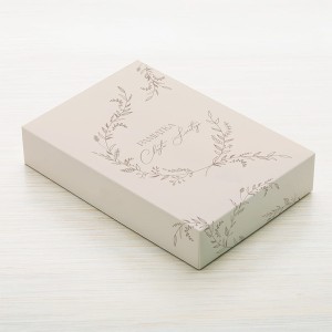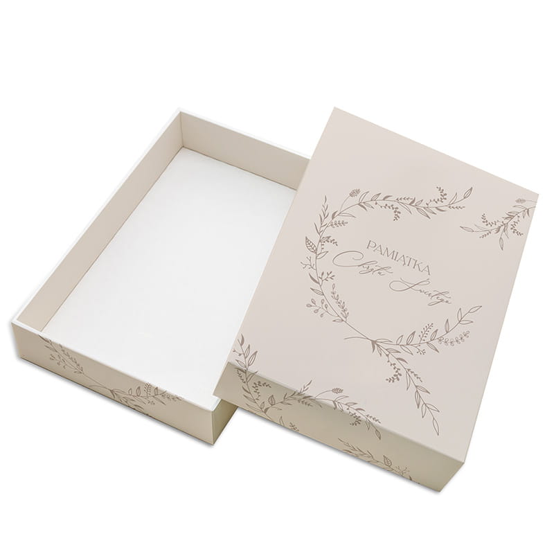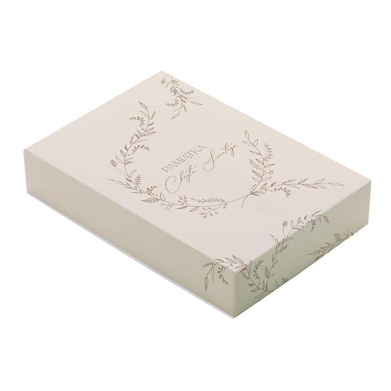Pudełko wykonane jest z twardego kartonu w odcieniu jasnego beżu. Wieczko ozdobiono delikatnym florystycznym wzorem w stylu line-art. Centralnie umieszczony jest napis „Pamiątka Chrztu Świętego”. Pudełko na szatkę ma idealne wymiary, by bezpiecznie pomieścić ozdobną szatkę chrzcielną.