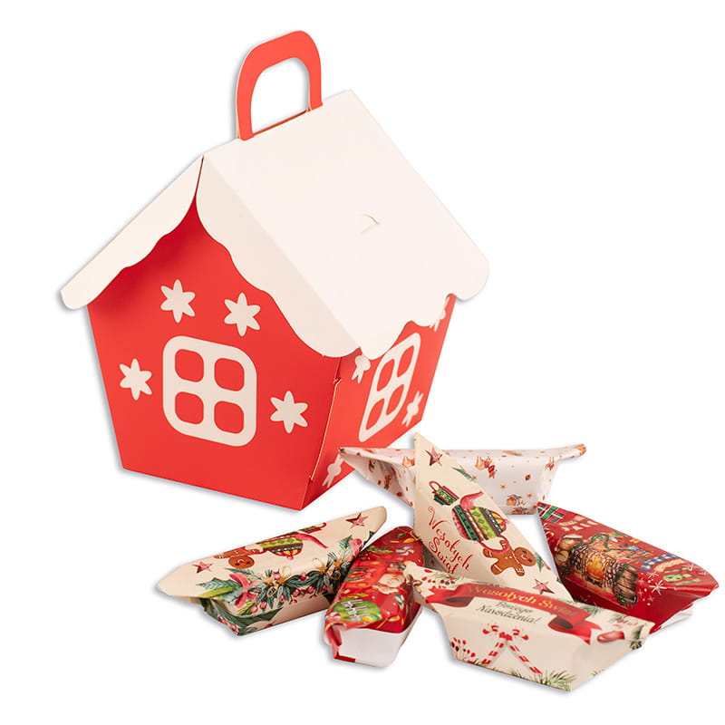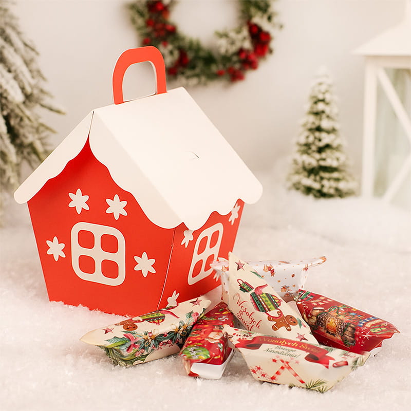 Pudełko ma kształt domku z czerwonymi ścianami oraz białym dachem stylizowanym na lukier. Przód ozdobiono okienkami oraz śnieżynkami, co tworzy efekt przytulnego piernikowego domku prosto z bajki. Na górze znajduje się uchwyt, dzięki któremu opakowanie wygodnie się przenosi. Wewnątrz ukryto kilka sztuk świątecznych krówek z życzeniami, które są nie tylko smaczne, ale i pełne pozytywnych słów. Każda krówka zapakowana została w osobny papierek z ilustracją – renifery, bombki, choinki, świąteczne napisy – wszystko spójne z bożonarodzeniowym klimatem.