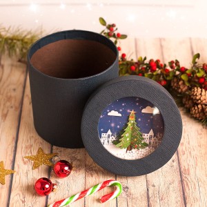 Pudełko ma kształt walca i zostało wykonane z grubej, sztywnej tektury w kolorze głębokiego granatu. Wieczko ozdobiono przezroczystym okienkiem z efektem 3D – w środku znajduje się miniaturowa choinka z drobnymi ozdobami, śnieżne kulki oraz grafika miasteczka na tle nocnego nieba.