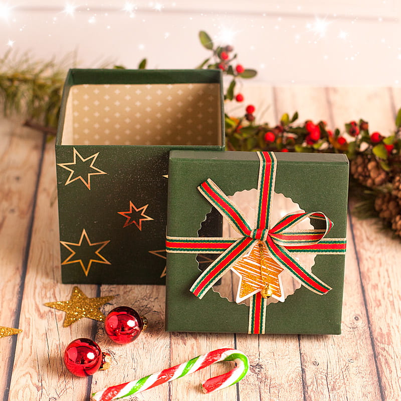 Pudełko wykonano z grubej, sztywnej tektury o ciemnozielonym kolorze ze złotym motywem gwiazdek. Wieczko wyposażone jest w wycięte okienko z przezroczystą folią, przez które widoczna jest zawartość. Na górze znajduje się także kolorowa wstążka w świątecznych barwach oraz zawieszka w kształcie choinkowej gwiazdki.