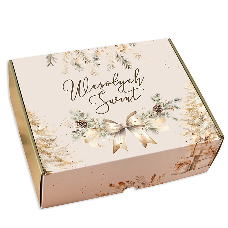 Pudełko wykonano z solidnego kartonu w odcieniu delikatnego beżu z pastelowymi motywami gałązek, szyszek i wstążek. Na froncie widnieje napis „Wesołych Świąt” otoczony świątecznymi ilustracjami. Wnętrze kryje nadrukowane życzenia z przesłaniem ciepła i spokoju, umieszczone w centralnym miejscu pokrywy. Całość dopełnia elegancka grafika prezentów i choinek. Rozmiar pudełka pozwala na zapakowanie zestawów świątecznych, rękodzieła, słodyczy czy innych niewielkich prezentów.