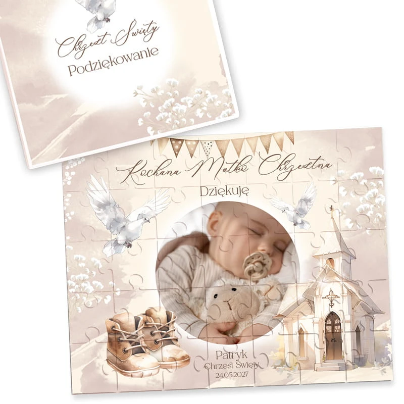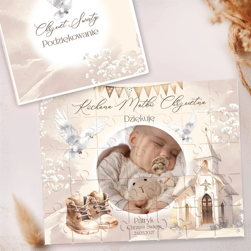 Personalizowane puzzle ze zdjęciem jako podziękowanie dla chrzestnych to niezwykle oryginalny i wzruszający sposób, aby wyrazić wdzięczność w dniu Chrztu Świętego.