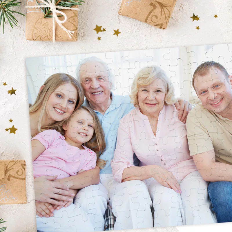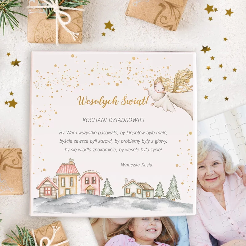 Personalizowane puzzle z Twoim zdjęciem i świątecznymi życzeniami to oryginalny prezent świateczny. Składają się ze 110 elementów i pakowane są w estetyczne pudełko z gotowym wzorem życzeń do wyboru. Idealny prezent na święta dla bliskiej osoby, który zachwyci i wzruszy, budując wspólne chwile przy układaniu.