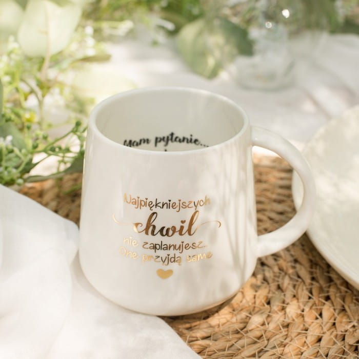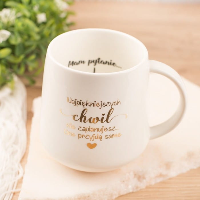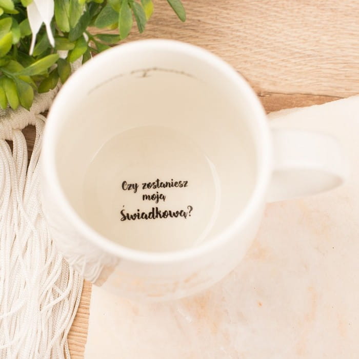 - Porcelanowy kubek w białym kolorze ma dwa warianty tekstów na zewnętrznej powierzchni. Na wewnętrznej ściance widnieje napis: Mam pytanie ..., zakończony jest on strzałką w dół, sugerując, że reszta pytania będzie umieszczona poniżej. Na dnie kubka znajduje się zapytanie: Czy zostaniesz moją Świadkową?