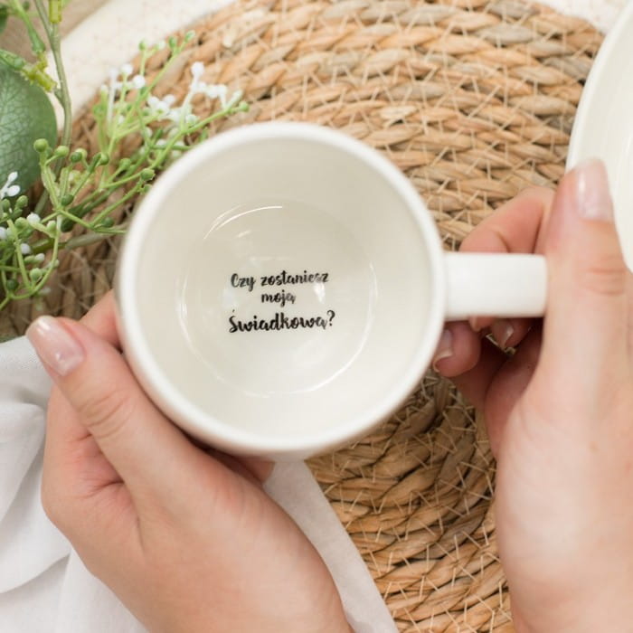 - Idealna prośba o świadkowanie dla bliskiej osoby. Obdarowana osoba na pewno pozytywnie zaskoczy się, gdy otrzyma taki oryginalny upominek. Pytanie do świadkowej powinno odbyć się w pomysłowy sposób. Dlatego można to zrobić podczas wspólnej kawy, czy herbaty! Na pewno przyjaciółka nie zorientuje się, a pytanie zobaczy w momencie, gdy wypije zawartość kubka.