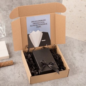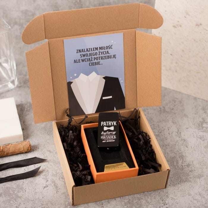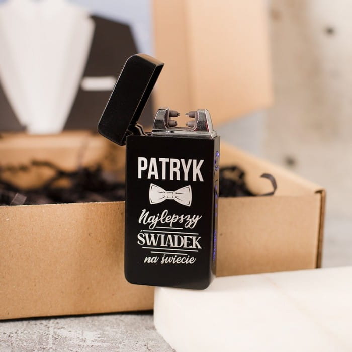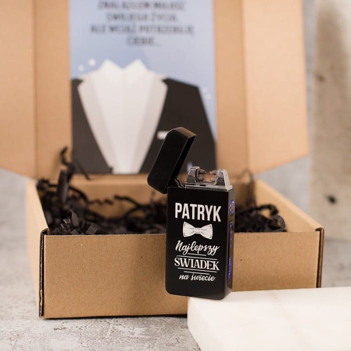 Ekskluzywna zapalniczka z grawerem to doskonały sposób, aby poprosić osobę o bycie świadkiem na ślubie. Zapalniczka jest metalowa i wyślemy ją do Ciebie w losowym kolorze: srebrnym lub czarnym. Z przodu umieścimy napis o treści: IMIĘ najlepszy świadek na świecie. Pomiędzy wyrazami widnieje grafika w postaci eleganckiej muszki. Zapalniczka posiada dołączony kabel USB do ładowania. Zestaw zapakowany jest w ozdobne pudełko. Na pokrywie pudełka od wewnątrz umieszczona jest grafika przedstawiająca fragment ślubnego garnituru oraz napis: Znalazłem miłość swojego życia, ale wciąż potrzebuję Ciebie… Całość utrzymana jest w stylu retro i prezentuje się niezwykle elegancko. Zapalniczka elektryczna w ozdobnym pudełku to oryginalna forma prośby o świadkowanie, która z pewnością poruszy Twojego przyjaciela lub brata.
