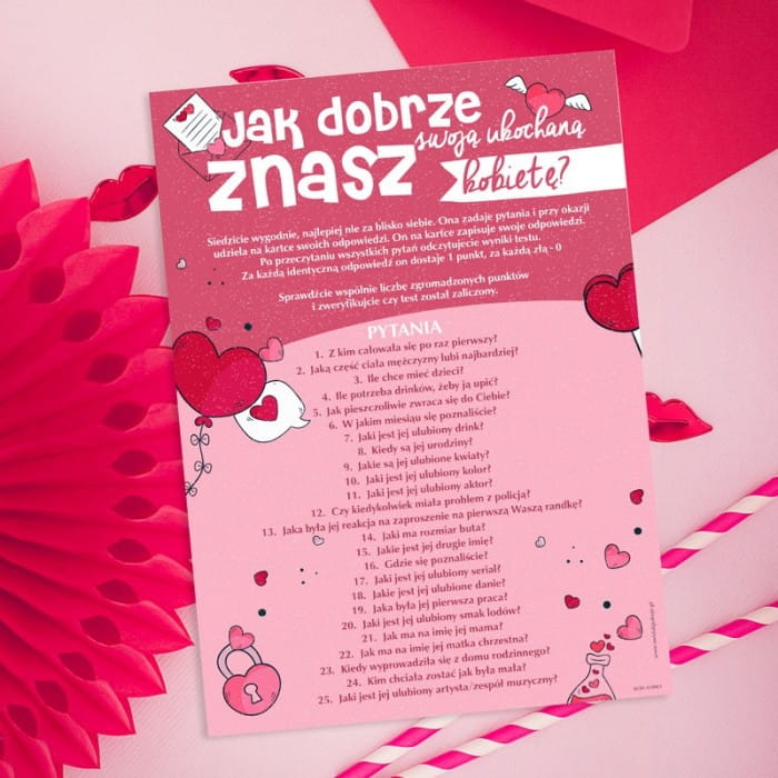 Quiz walentynkowy dla niego „jak dobrze znasz swoją kobietę” znajduje się na kartce o formacie A4. Wykonana jest ona z materiału o większej gramaturze, co zapewnia sztywność. Do tego forma quizu jest bardzo atrakcyjna wizualnie. Dominuje kolor różowy i czerwony w różnych odcieniach. A jak wiadomo są one synonimem zakochania, romantyzmu i miłości. M.in. w teście znajdują się pytania: