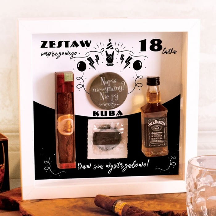 - Ta wyjątkowa ramka z gadżetami na osiemnastkę to gotowy pomysł na prezent. Wewnątrz znajduje się cygaro z czekolady, prezerwatywa oraz otwieracz do piwa Całość uzupełnia biało-czarna grafika i zabawny napis wewnątrz oraz personalizacja w postaci imienia chłopaka. Upominki są w zamkniętej ramce, która okaże się niezastąpioną pamiątką na lata, nawet po tym, jak zniknie jej zawartość. Na biało czarnym tle znajdują się śmieszne napisy uzupełnione o imię. Za szybką z kolei są gadżety, które nie wiadomo kiedy i gdzie mogą się przydać: