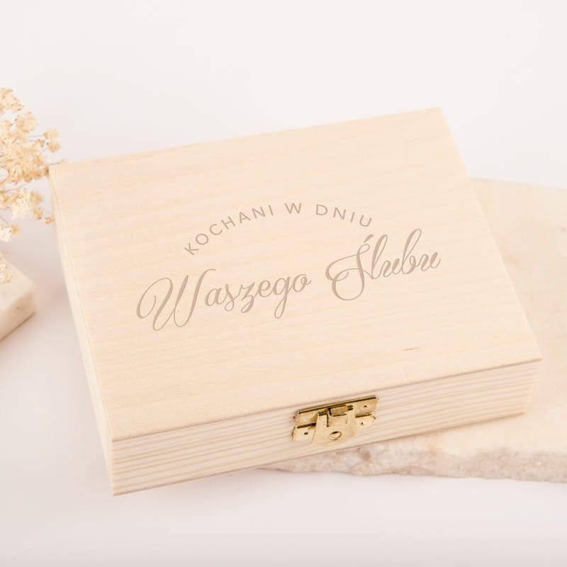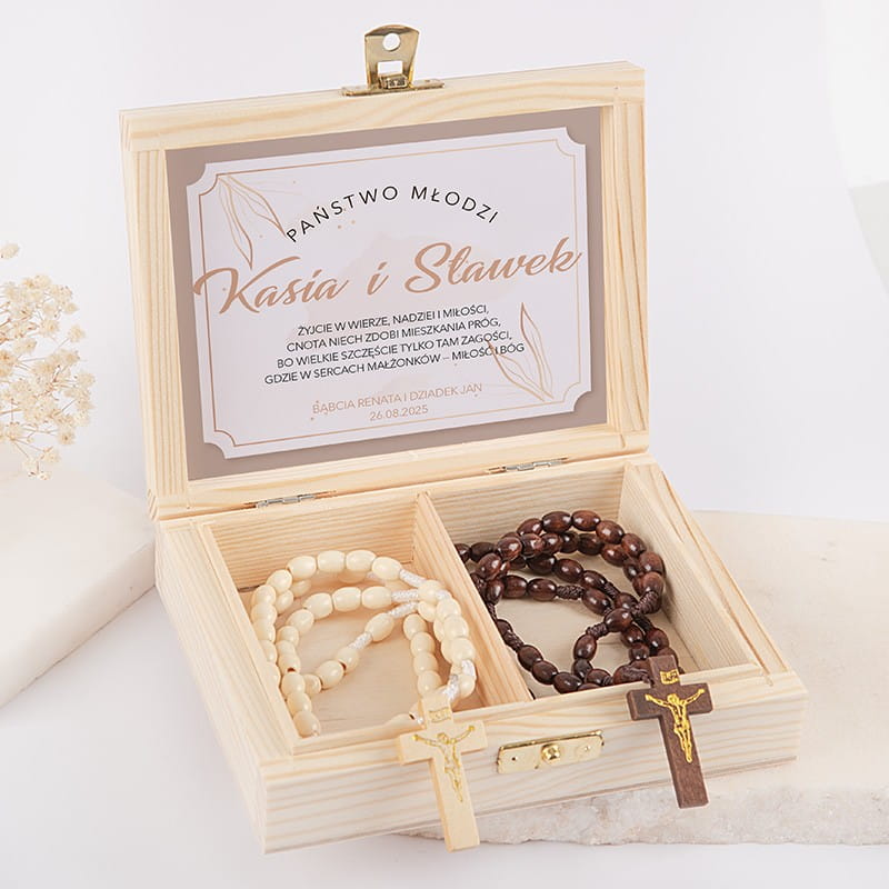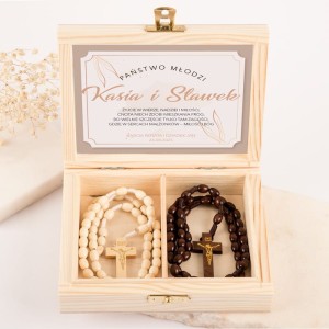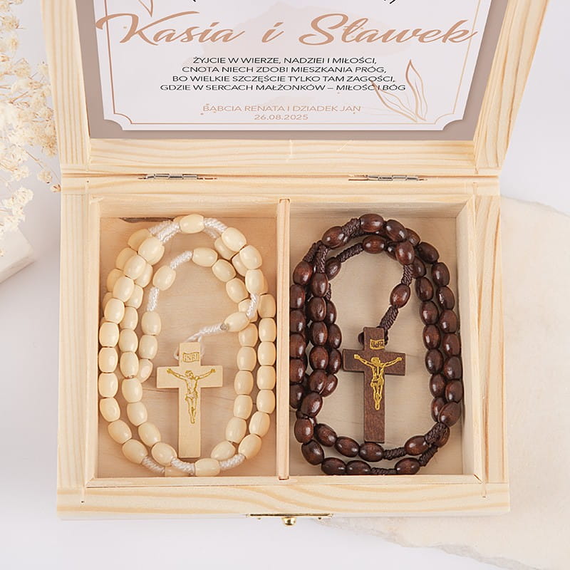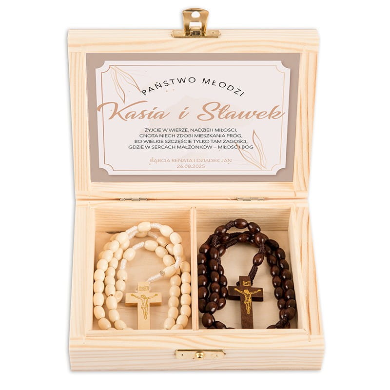 Całość składa się z dwóch drewnianych różańców – jasnego i ciemnego – umieszczonych w osobnych przegródkach w solidnym, naturalnym pudełku z zamknięciem. Wnętrze wieczka zawiera elegancką etykietę z życzeniami i imionami nowożeńców. Front pudełka ozdobiono delikatnym napisem „Kochani w dniu Waszego Ślubu”, który współgra z jasnym odcieniem drewna i złotym zapięciem. Każdy różaniec posiada krzyż z grawerem, a ich kolory symbolizują jedność dwóch osób idących wspólną drogą.