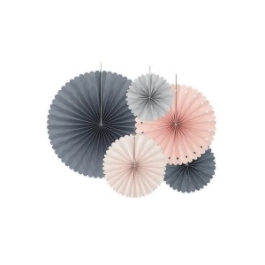 Zestaw zawiera 5 papierowych rozet o zróżnicowanych średnicach. Duże ozdoby mogą wisieć na ścianie i pod sufitem, podczas gdy mniejsze rozmiary doskonale posłużą jako rozetki na prezenty lub dekoracje stołu, razem tworząc spójną całość. Nasz sklep, przewidując trendy w kolorystyce, proponuje zestawy w hitowych, pastelowych odcieniach szarości, kremu i różu. Zestawy można dowolnie łączyć lub skupiać się na wybranej kolorystyce. Taka paleta barw idealnie wpisuje się w dziewczęcy kanon wieczoru panieńskiego, którego myślą przewodnią są style glamour, boho lub typowa nowoczesność.