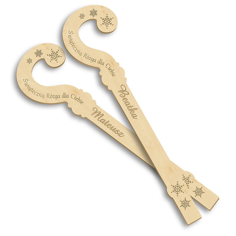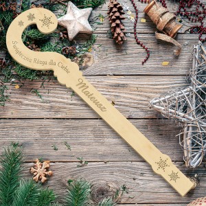 Wykonana z naturalnego, nielakierowanego drewna rózga posiada starannie wycięty kształt nawiązujący do tradycyjnej laski pasterskiej. Na końcu znajduje się estetyczny grawerunek w postaci śnieżynek oraz humorystyczny napis: „Świąteczna Rózga dla Ciebie”. Najważniejszym elementem produktu jest jednak personalizowany grawer z imieniem, który nadaje upominkowi indywidualnego charakteru. Drewniana jest lekka, gładko wykończona i przyjemna w dotyku, co czyni ją idealnym gadżetem dekoracyjnym lub symbolicznym dodatkiem do większego prezentu. Jej naturalny kolor i prostota sprawiają, że doskonale wpisuje się w estetykę świątecznych aranżacji w stylu rustykalnym i skandynawskim.