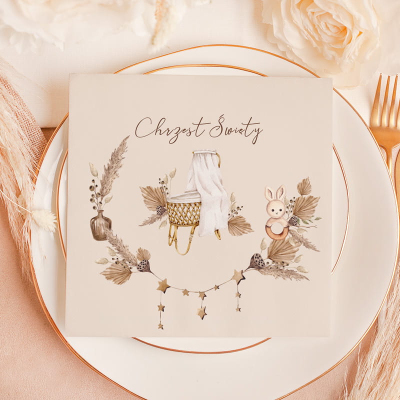 Każda serwetka została wykonana z miękkiego, trójwarstwowego papieru i ma jasnobeżowe tło. Centralną część zdobi grafika z wiklinowym koszem, suszonymi trawami i gryzakiem z króliczkiem – motywami bliskimi naturze. U góry umieszczono napis „Chrzest Święty” w eleganckiej kaligrafii.
