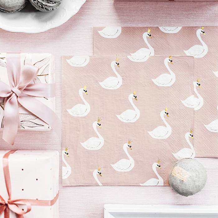 Serwetki z łabędziami to idealny wybór na urodziny dla dziewczynek. Delikatny różowy kolor w połączeniu z eleganckim motywem łabędzi w koronach tworzy bajkową atmosferę na każdym przyjęciu. Te papierowe serwetki na urodziny świetnie sprawdzą się jako dekoracja stołu dla małych miłośniczek zwierzątek i delikatnych, pastelowych motywów.