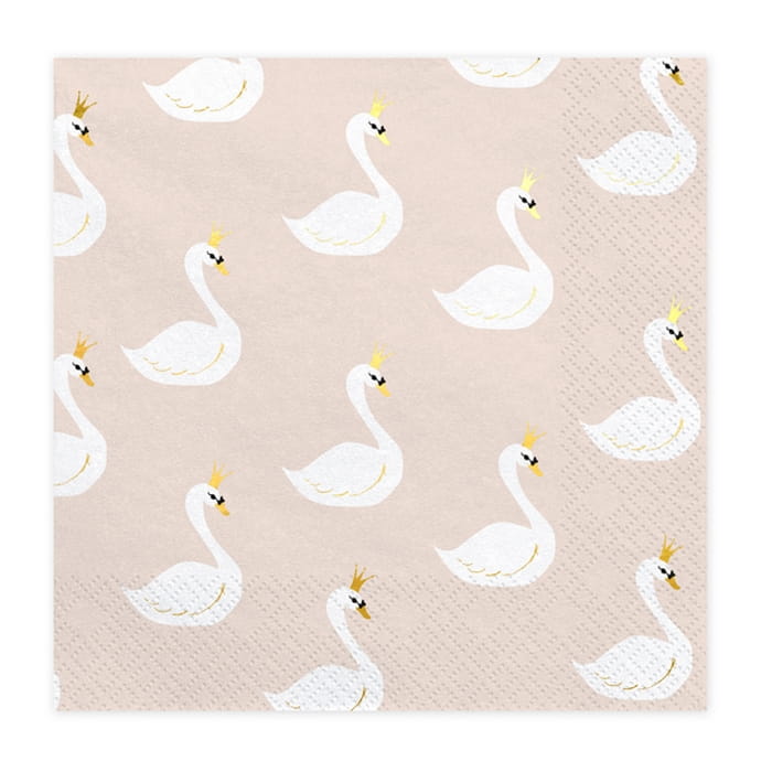 Każda z serwetek ma wymiary 33x33 cm i została wykonana z chłonnego papieru. Na jasnoróżowym tle umieszczono wzór białych łabędzi z oczami i złotymi koronami. Detale takie jak złote akcenty nadają im bajkowego uroku. Motyw jest powtarzalny i rozmieszczony równomiernie na całej powierzchni.