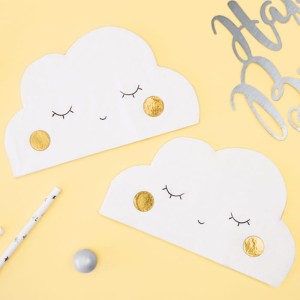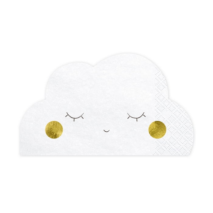 Serwetki wykonane są z miękkiego, chłonnego papieru o wysokiej jakości. Mają formę białej chmurki z delikatnie zarysowanymi oczkami, uśmiechem i złotymi rumieńcami. W opakowaniu znajduje się 20 sztuk – idealna liczba na średniej wielkości przyjęcie urodzinowe.