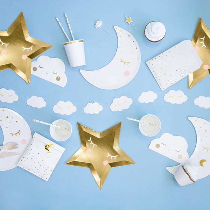 Ozdobne serwetki w kształcie chmurki to idealny dodatek na urodziny i każde dziecięce przyjęcie. Delikatna forma, złote akcenty i uśmiechnięta buzia nadają im wyjątkowy, przyjazny charakter. Świetnie komponują się z pastelowymi dekoracjami. Te serwetki chmurka wprowadzają bajkowy nastrój i są praktycznym elementem stołu na imprezie dla najmłodszych.