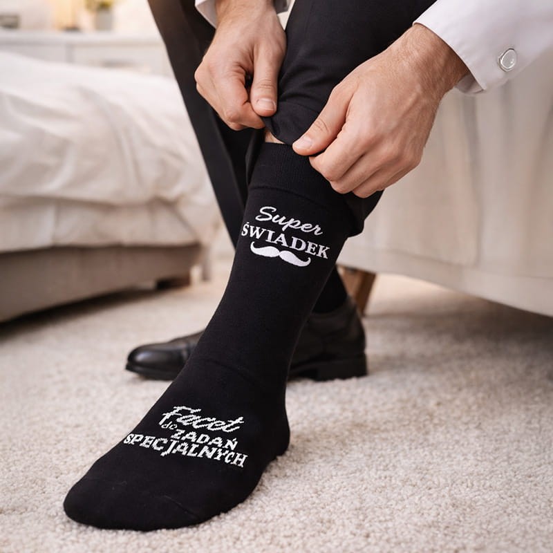 Skarpetki mogą posłużyć zarówno jako część prezentu na pytanie, jak i również podziękowanie za świadkowanie. Z pewnością obdarowana osoba zachwyci się takim praktycznym, ale także eleganckim upominkiem. Skarpetki z napisem mogą posłużyć jako część stylizacji świadka podczas Waszej uroczystości zaślubin. Obdarowany świadek z pewnością gdy otrzyma takie, skarpetki poczuje się doceniony, a także wyróżniony. Twój brat, przyjaciel, czy najlepszy kumpel na pewno zachwyci się takim podarunkiem od Was. Skarpetki są w uniwersalnym rozmiarze, przez co pasują praktycznie dla każdego świadka. Jak wyrazić wdzięczność świadkowi? Z pewnością poprzez niezwykły podarunek, jakim są skarpetki z nadrukiem. Wasz świadek na pewno będzie z dumą nosić takie skarpetki, chcąc pochwalić się, że jest super świadkiem.