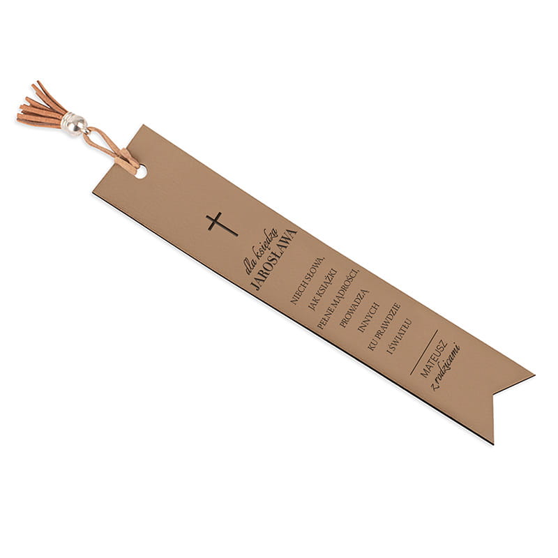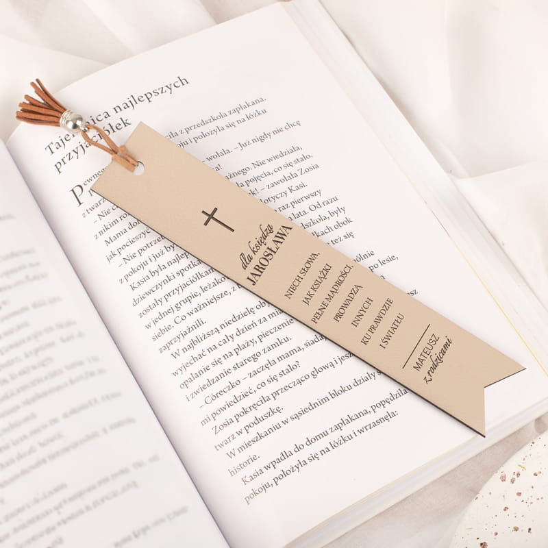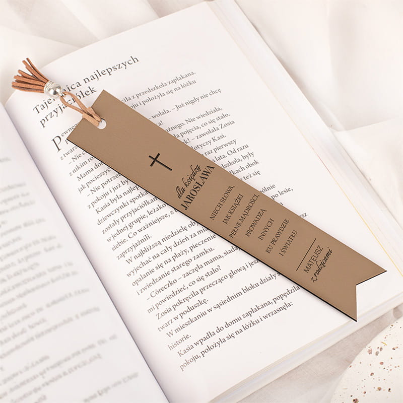 Centralnym punktem zakładki jest piękny cytat, który nawiązuje do misji kapłańskiej, podkreślając mądrość, wsparcie oraz troskę księdza do innych ludzi. Obok cytatu znajduje się subtelny, symboliczny krzyż, który wzmacnia duchowy charakter upominku. Dodatkowo zakładkę personalizujemy, umieszczając imię obdarowanego księdza oraz Twój podpis, co nadaje jej szczególnego, osobistego znaczenia. Praktyczne trójkątne wycięcie na końcu ułatwia użytkowanie, pozwalając na łatwe wsunięcie zakładki między strony. Stylowym akcentem jest także skórzany, brązowy chwost ozdobiony srebrnym koralikiem – elegancki detal, który nadaje zakładce wyjątkowego uroku.