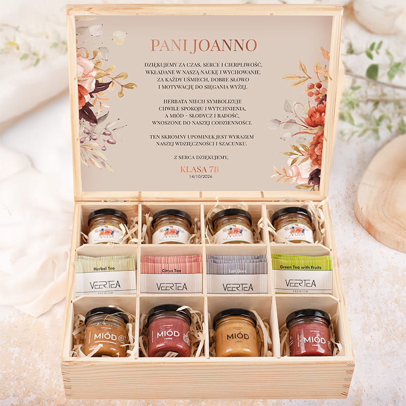 Skrzynka wykonana jest z wysokiej jakości drewna, co nadaje jej elegancki i ponadczasowy wygląd. Wnętrze skrzynki zostało zaprojektowane w sposób przemyślany - znajduje się w niej dwanaście przegródek, w których umieszczono sześć słoiczków miodu oraz dwanaście paczek herbaty w różnych smakach, idealnych do relaksu po długim dniu. Każdy z słoiczków miodu to naturalny, zdrowy produkt, który doskonale komponuje się z aromatyczną herbatą. Na froncie skrzynki umieszczono elegancką, personalizowaną etykietę ozdobioną kwiatowym motywem w ciepłych jesiennych barwach. Etykieta zawiera również dedykację, którą można dostosować, dzięki czemu prezent nabiera osobistego charakteru. W zestawie znajdują się także wszystkie szczegóły: imię obdarowanego oraz data, godzina narodzin, a także inne istotne informacje, które sprawiają, że prezent staje się niezastąpioną pamiątką.