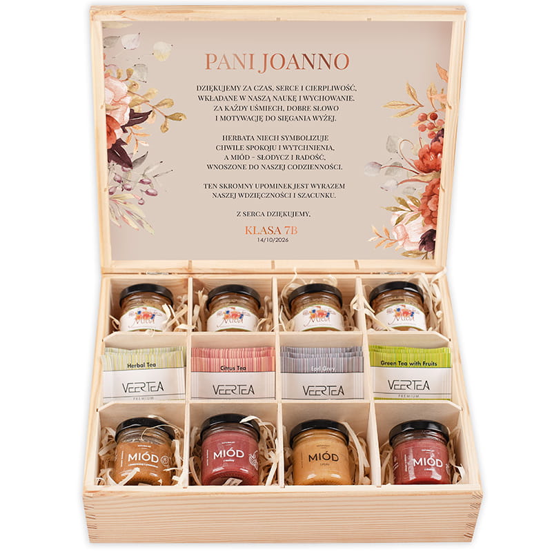 Drewniana skrzynka z herbatą i miodami to doskonały prezent na Dzień Nauczyciela, zakończenie roku szkolnego, ale także na wiele innych okazji, gdy chcemy podziękować za trud, zaangażowanie i serce włożone w nauczanie i wychowanie. Personalizowana etykieta sprawia, że skrzynka staje się wyjątkowym podarunkiem, który wprost wyraża wdzięczność. Zestaw idealnie sprawdzi się również jako upominek dla wychowawcy, nauczyciela przedmiotu czy osoby, która odegrała ważną rolę w życiu uczniów. Drewniana skrzynka z herbatą i miodami jest nie tylko praktycznym, ale również bardzo estetycznym prezentem, który może stać się elegancką ozdobą w domu czy na biurku. Poza walorami estetycznymi, zestaw zapewnia chwilę spokoju dzięki swojej zawartości – herbacie i miodzie, które przywołują uczucie relaksu. Takie podziękowanie jest ponadczasowe i zawsze w dobrym guście, dlatego świetnie pasuje do każdej okazji, gdzie chcemy wyrazić wdzięczność za pomoc i cierpliwość.