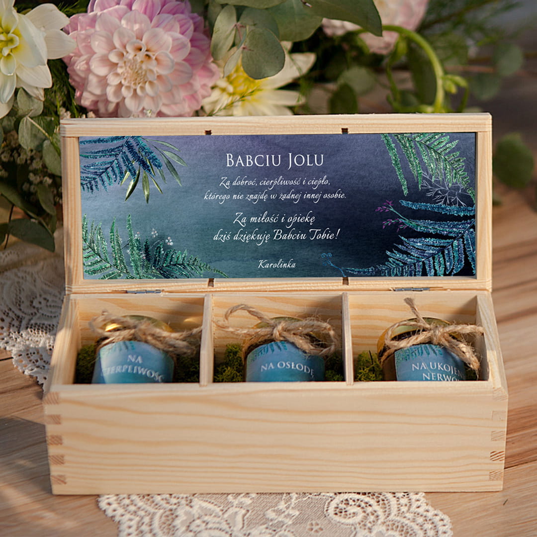 Wewnątrz drewnianej skrzynki znajdują się trzy szklane słoiczki wypełnione miodem, każdy opatrzony napisem – „Na cierpliwość”, „Na osłodę”, „Na ukojenie nerwów”. Całość wyłożona jest naturalnym wypeniaczem, co nawiązuje do stylistyki rustykalnej. Pokrywka od środka zawiera ozdobną grafikę z liśćmi paproci na ciemnym tle oraz miejsce na personalizowane życzenia i podpis. To personalizowany prezent dla Babci, który prezentuje się estetycznie i elegancko, a jednocześnie ma praktyczne zastosowanie. Ręczne wykonanie i naturalne materiały podkreślają jego wyjątkowy charakter.