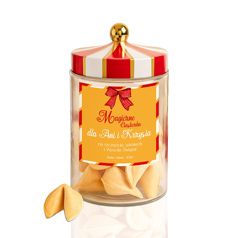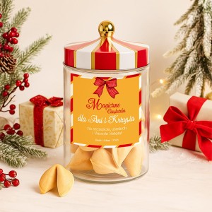 Produkt został zaprojektowany z dbałością o każdy detal. Wysokiej jakości szklany słoik z efektownym wieczkiem w czerwono-białe pasy i złotą kulką na szczycie przyciąga wzrok i dodaje całości charakteru. Główne miejsce zajmuje personalizowana etykieta z napisem "Magiczne Ciasteczka", którą można dostosować dodając imię obdarowywanej osoby, podpis i datę. Sama zawartość to zestaw zapieczonych ciasteczek z wróżbą, które mają złocisty kolor i delikatny, chrupiący smak. Słoik może być później wykorzystany jako dekoracja, pojemnik na słodycze lub element świątecznego wystroju – to więc nie tylko słodki dodatek, ale i praktyczna ozdoba.