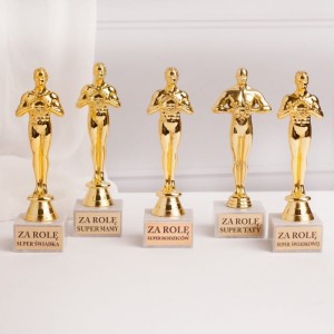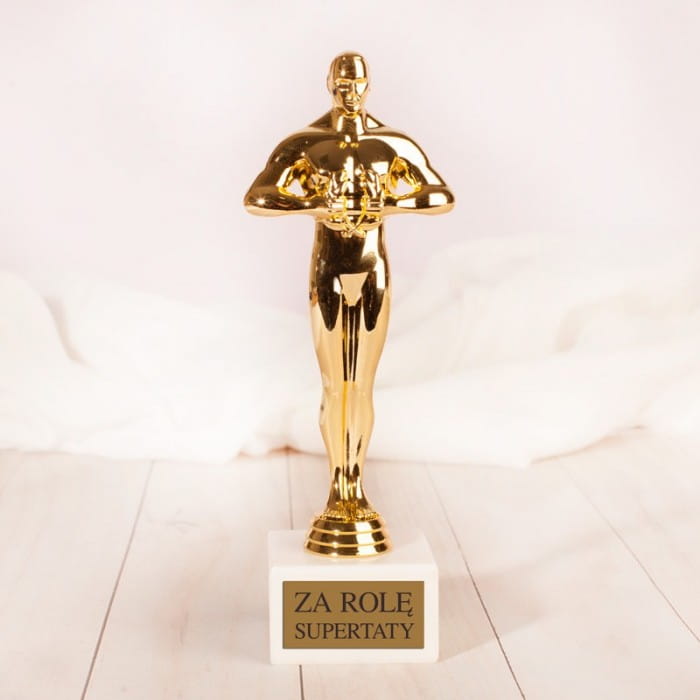 - Statuetka w złotym, połyskującym kolorze na kamiennym podstawce. Kształt figurki nawiązuje kształtem i wyglądem do prestiżowej nagrody, którą wręcza się najwybitniejszym osobom ze świata filmu.