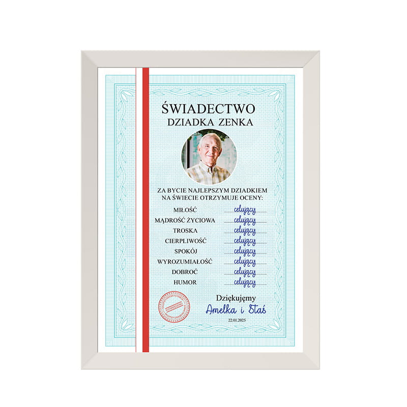 Produkt został starannie opracowany graficznie z dbałością o każdy szczegół. W centralnej części znajduje się okrągłe zdjęcie dziadka, a poniżej zestaw ocen w formacie szkolnym – każda z nich to „celujący” za takie wartości jak miłość, humor czy dobroć. Po lewej stronie znajduje się ozdobny pasek w kolorze czerwonym, który wizualnie przypomina klasyczne świadectwa szkolne. Całość wydrukowana jest na wysokiej jakości papierze, który dobrze odwzorowuje kolory i szczegóły. W komplecie znajduje się biała ramka o rozmiarze A4, gotowa do postawienia lub zawieszenia. Dzięki temu personalizowany prezent dla dziadka nie wymaga dodatkowego przygotowania – wystarczy go wręczyć lub wysłać.