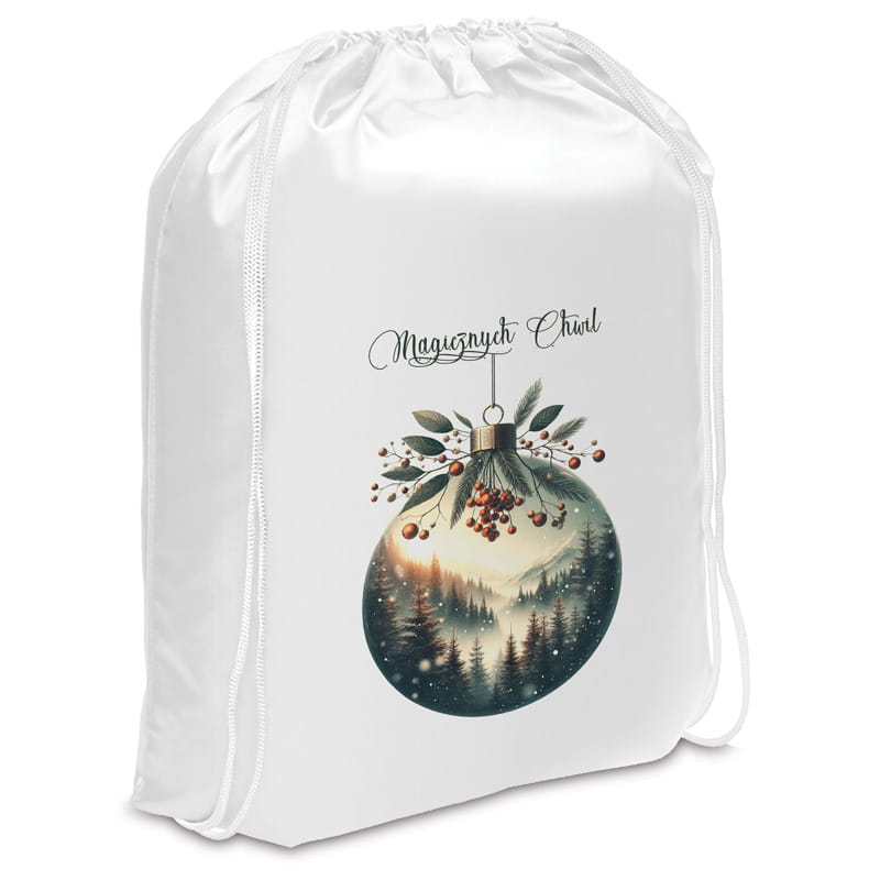 Produkt wykonany jest z białego, lekko błyszczącego materiału o gładkiej strukturze, który nadaje całości elegancki wygląd. W centralnej części worka znajduje się ilustracja bombki zawieszonej na gałązce z jarzębiną i liśćmi. Wnętrze bombki przedstawia malowniczy, zimowy pejzaż – ośnieżone góry, las i zachodzące słońce tworzą baśniową scenę. Nad grafiką znajduje się napis „Magicznych chwil” w ozdobnym, stylizowanym kroju pisma. Worek jest ściągany za pomocą dwóch sznurków po bokach.