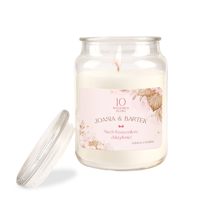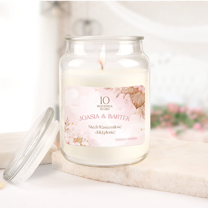 Produkt to świeca umieszczona w przezroczystym, prostym słoju z wieczkiem. Jej jasna barwa pasuje do stylu minimalistycznego, klasycznego i romantycznego. Etykieta utrzymana jest w jasnoróżowej tonacji z roślinnymi motywami i elegancką typografią – widnieje na niej informacja o rocznicy, imiona jubilatów oraz podpis wręczającego. Świeca wykonana jest z wysokiej jakości wosku, a po zapaleniu wypełnia pomieszczenie subtelnym zapachem. Całość jest lekka, ale trwała, dobrze prezentuje się zarówno w opakowaniu, jak i po rozpakowaniu – gotowa do ustawienia na stole, komodzie lub półce.