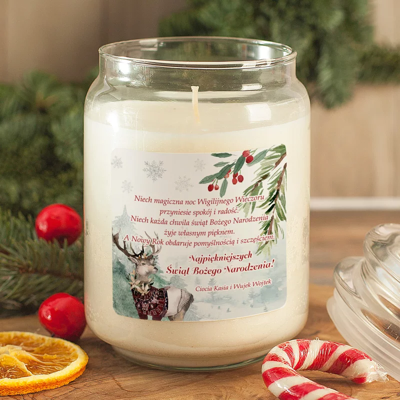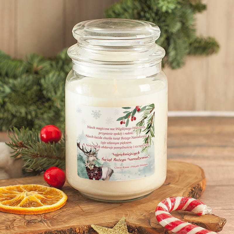 Świeca zapachowa Magia została zamknięta w ozdobnym szklanym słoiku z charakterystycznym, stylowym wieczkiem, które podkreśla jej świąteczny charakter. Na przedniej ściance słoika znajduje się etykieta z nastrojową grafiką przedstawiającą jelonka w zimowym krajobrazie, otoczonego choinkami i śnieżynkami. U góry etykiety umieszczone są zielone gałązki z czerwonymi owocami ostrokrzewu, które dodają całości ciepła i naturalnego uroku. Złote i czerwone napisy wprowadzają elegancję, a centralne miejsce zajmują życzenia: „Niech magiczna noc Wigilijnego Wieczoru przyniesie spokój i radość. Niech każda chwila Świąt Bożego Narodzenia żyje własnym pięknem. A Nowy Rok obdaruje pomyślnością i szczęściem. Najpiękniejszych Świąt Bożego Narodzenia!”. Pod tekstem znajduje się miejsce na personalizację, czyli imiona osób lub rodzin, od których pochodzi prezent. Całość utrzymana jest w zimowej, stonowanej kolorystyce, dzięki czemu świeca idealnie wpisuje się w świąteczne aranżacje i stanowi subtelny, ale wyrazisty element dekoracyjny.