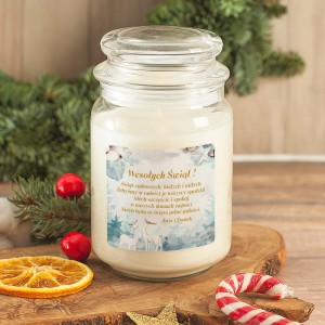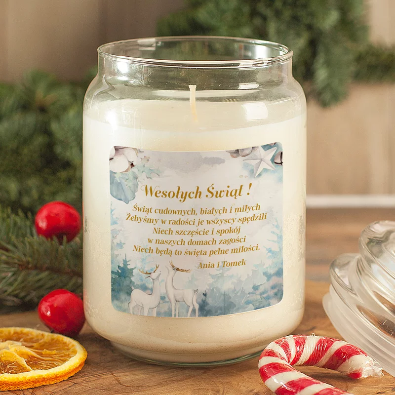 Świeca została umieszczona w szklanym słoiku z ozdobnym wieczkiem, które podkreśla jej świąteczny charakter i jednocześnie chroni delikatny zapach jaśminu. Na froncie słoiczka znajduje się personalizowana etykieta utrzymana w zimowej, akwarelowej stylistyce. Na tle błękitnego lasu pojawiają się dwa białe renifery, srebrne dzwoneczki oraz napisy w złotym kolorze, które nadają całości eleganckiego wyglądu. Centralną część etykiety zajmują świąteczne życzenia: „Wesołych Świąt! Świąt cudownych, białych i miłych, żebyśmy w radości je wszyscy spędzili. Niech szczęście i spokój w naszych domach zagości. Niech będą to święta pełne miłości.” Pod tekstem umieszczane są imiona, co nadaje świecy indywidualny charakter i sprawia, że nabiera symbolicznego znaczenia. Całość prezentuje się subtelnie, nowocześnie i z klasą, dlatego idealnie pasuje zarówno do tradycyjnych, jak i minimalistycznych wnętrz.