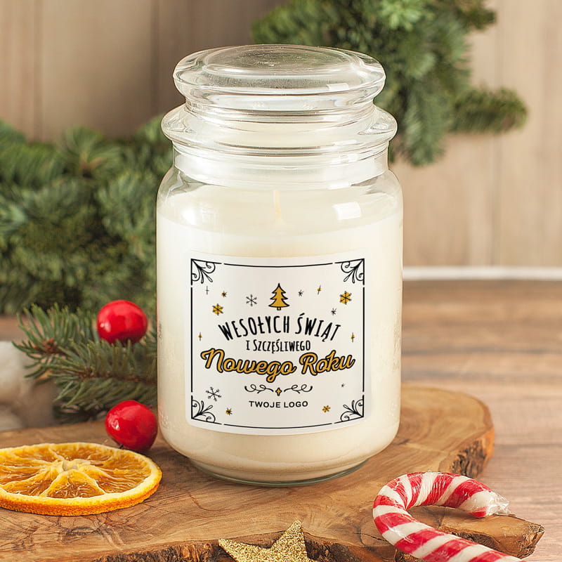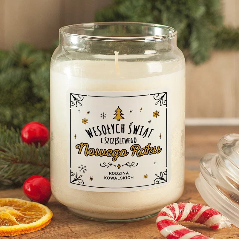 Świeca została zamknięta w szklanym słoiku z ozdobnym wieczkiem, który nadaje całości elegancki wygląd i sprawia, że prezentuje się znakomicie w każdym wnętrzu. Na przedniej ściance słoika znajduje się personalizowana etykieta utrzymana w czarno-złotej kolorystyce, która pięknie komponuje się ze świątecznymi aranżacjami. Zdobienia w formie choinki, gwiazdek i subtelnych ornamentów przyciągają wzrok i tworzą spójną kompozycję. Na etykiecie widnieje ozdobny napis „Wesołych Świąt i Szczęśliwego Nowego Roku”, wykonany czcionką w kolorze czarnym i złotym. Pod życzeniami znajduje się miejsce na imiona lub logo, co pozwala stworzyć wyjątkowy, personalizowany prezent. Dzięki takiemu detalowi świeca nabiera niepowtarzalnego charakteru i doskonale sprawdzi się zarówno jako prezent rodzinny, jak i elegancki upominek firmowy. Całość prezentuje się spójnie i stylowo, dlatego świeca może być także elementem dekoracyjnym, który doda wnętrzu blasku i ciepła.