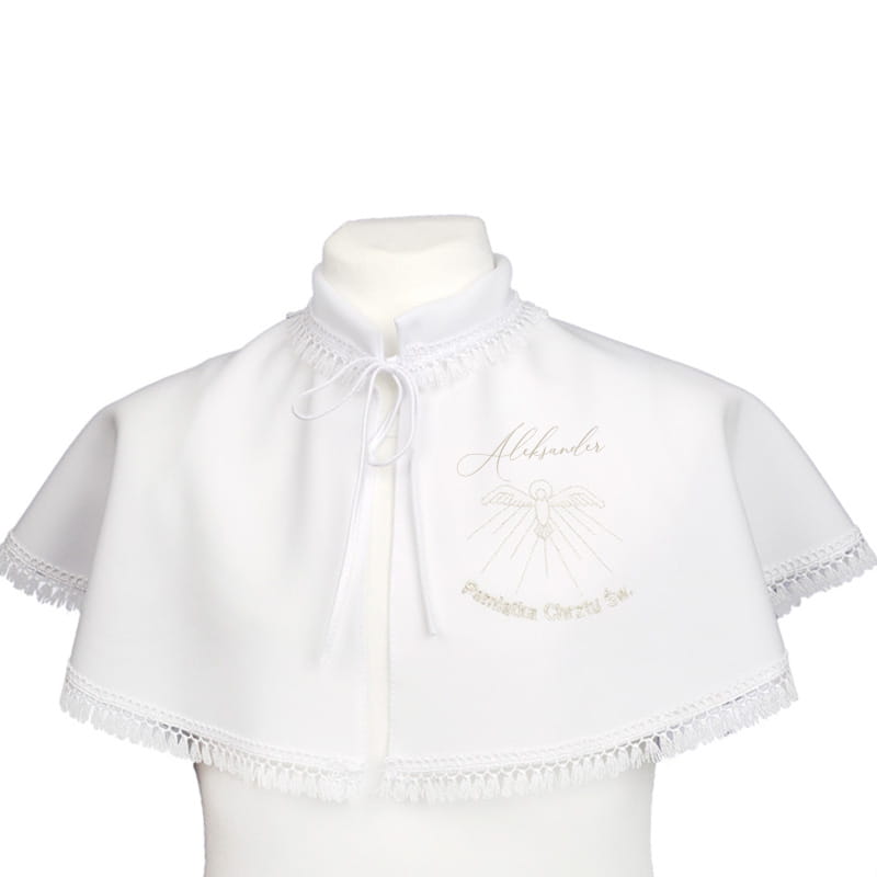 Delikatna szatka pelerynka do chrztu została zaprojektowana z myślą o starszych dzieciach. Wykonana z białej tkaniny, wykończona elegancką koronką i zawiązywana pod szyją. Na przodzie widnieje subtelny, ozdobny haft z motywem Ducha Świętego i personalizowanym imieniem. Idealna dla chłopca i dziewczynki, zachowuje uroczysty charakter sakramentu.