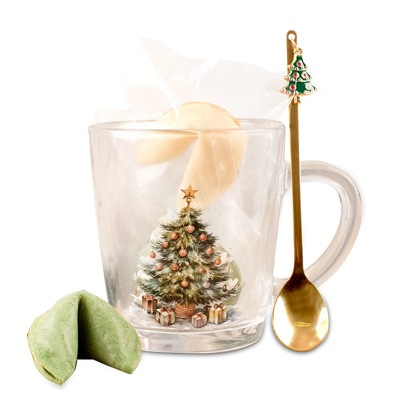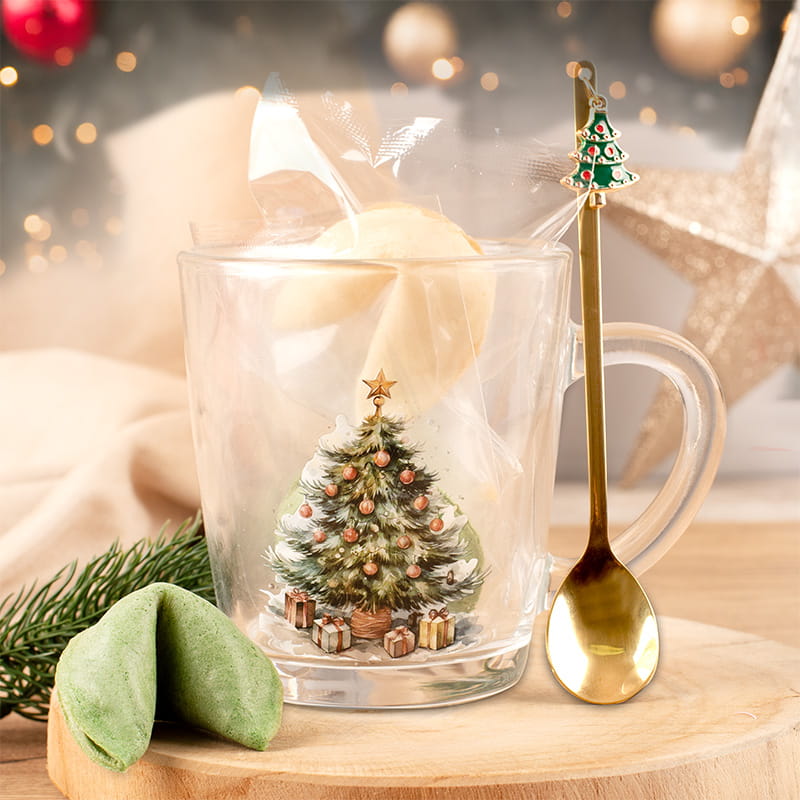 Świąteczna szklanka z grafiką choinki, złotą łyżeczką i ciasteczkami z wróżbą to gotowy upominek, który sprawdzi się jako drobny prezent dla bliskiej osoby. Zestaw zachwyca detalami – od dekoracyjnego nadruku, przez świąteczną zawieszkę na łyżeczce, aż po symboliczne ciasteczka. Całość tworzy przyjemną i przemyślaną kompozycję w świątecznym klimacie.
