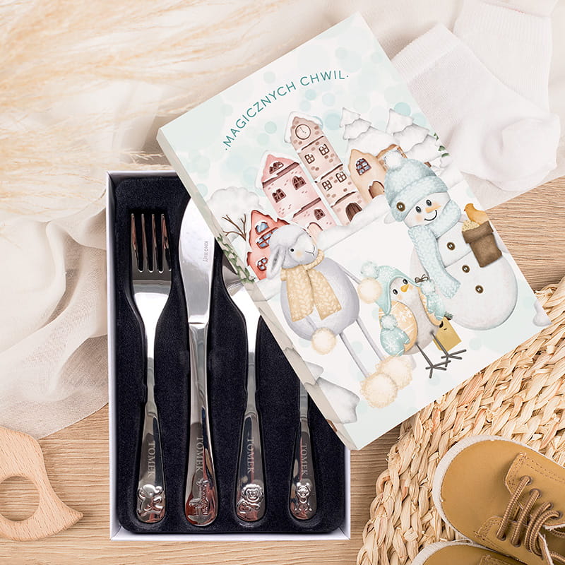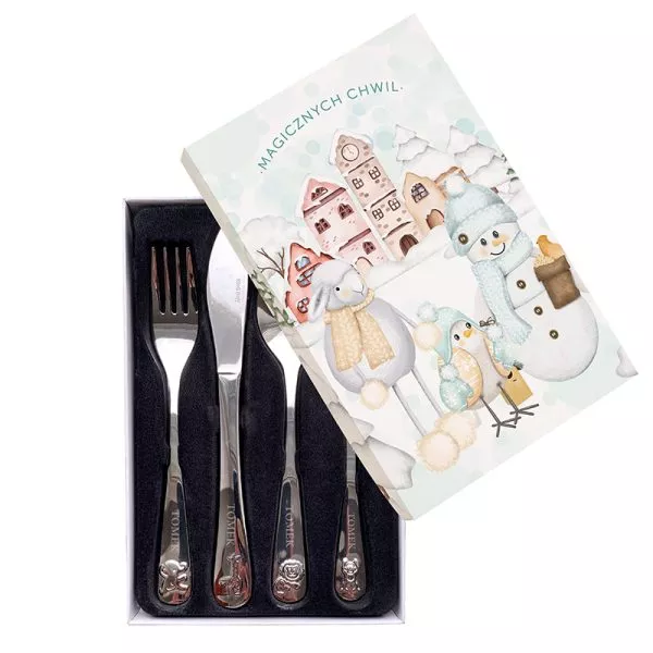 Zestaw zawiera cztery elementy: widelec, nóż, łyżkę oraz małą łyżeczkę. Każdy z nich ozdobiony jest motywem zwierzątek, dzięki czemu staje się atrakcyjny i przyjazny dla najmłodszych użytkowników. Detale są precyzyjnie wykonane, a całość zapakowana w sztywne, zamykane pudełko z ilustracją zimowego miasteczka oraz napisem „Magicznych chwil”. Pudełko nadaje się do wręczenia bez potrzeby dodatkowego pakowania prezentowego. Personalizacja wykonana jest trwałym grawerem na uchwytach sztućców, co sprawia, że całość prezentuje się elegancko i subtelnie.