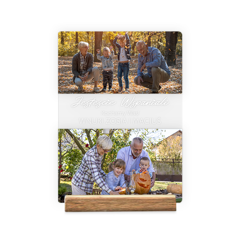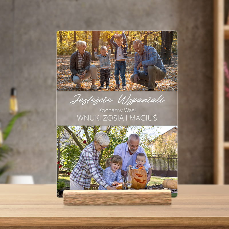 Produkt wykonany jest z przezroczystego akrylu o wysokiej przejrzystości, co nadaje mu elegancki i nowoczesny wygląd. Tabliczka ma prostokątny kształt z zaokrąglonymi rogami, a zdjęcia drukowane są w wysokiej rozdzielczości, co zapewnia im głębię kolorów i trwałość. Środkowa część zawiera napis „Jesteście Wspaniali Kochamy Was!” – pod nim można umieścić imiona wnuków. Całość umieszczona jest na estetycznej podstawce z drewna, dzięki czemu tabliczka dobrze prezentuje się na półce, komodzie czy biurku. Minimalistyczny design sprawia, że pasuje zarówno do nowoczesnych, jak i klasycznych wnętrz.